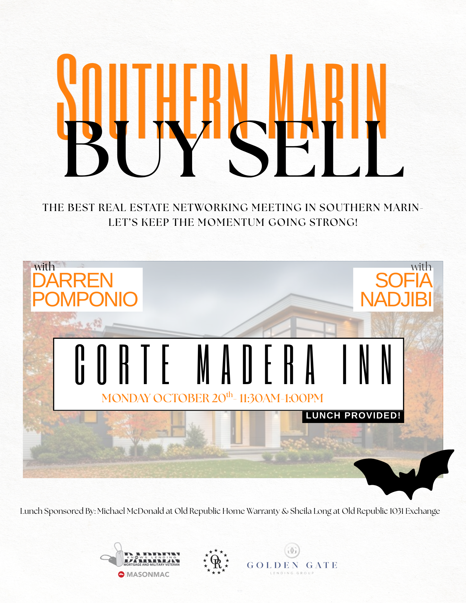 Let’s keep the momentum in October for the In-Person Southern Marin Buy/Sell Meeting! We will cover everything from off market listings, coming soon listings, flips, fixers, hidden gems, and so much more! This will be an amazing monthly event to connect, share resources, generate referrals, and talk all things Marin County real estate! Join us for a hosted lunch where you can present your listings, share buyer needs, expand your network, and uncover new opportunities.